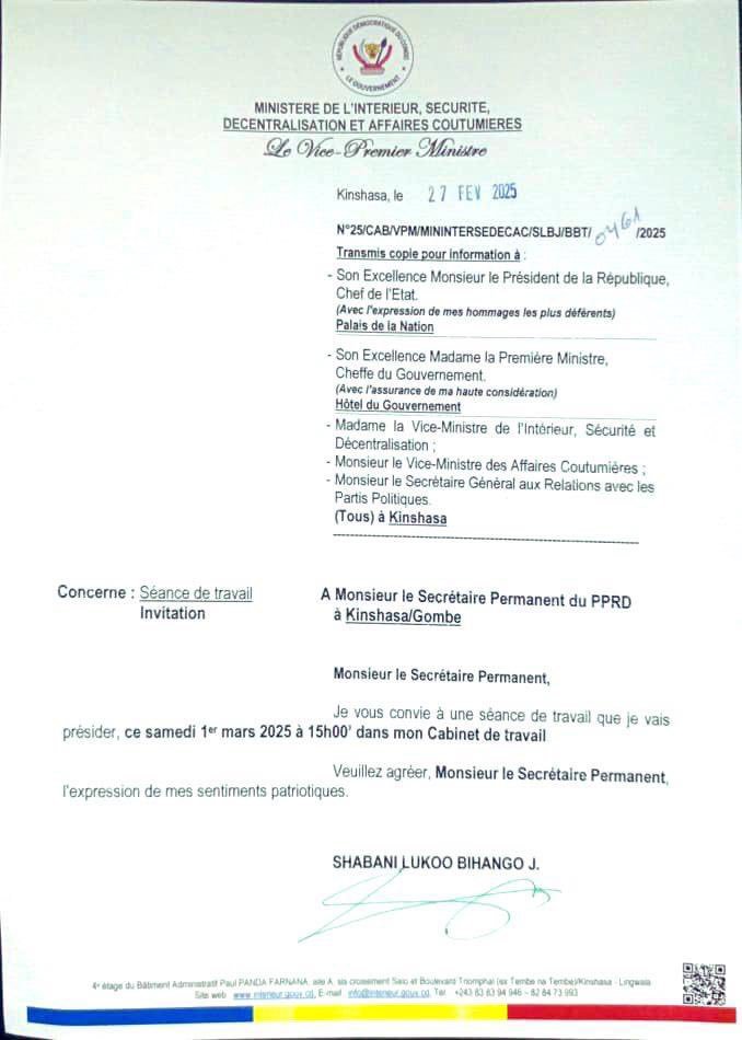 Dans une correspondance, du ministère de l’intérieur dont une copie est parvenue à la rédaction de Congo Market News ce vendredi 28 février 2025, les raisons précises de cette convocation demeurent inconnues. Cependant, celle-ci intervient dans un contexte tendu marqué par la vive réaction du PPRD aux accusations portées par Jean-Pierre Bemba, ministre des Transports, contre l’ancien président Joseph Kabila. Ce dernier est soupçonné d’être le commanditaire de la milice Mobondo, responsable de violences dans la province du Kwilu.