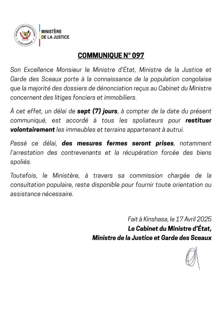 RDC : 7 jours accordés aux spoliateurs pour restituer les biens immobiliers acquis illégalement