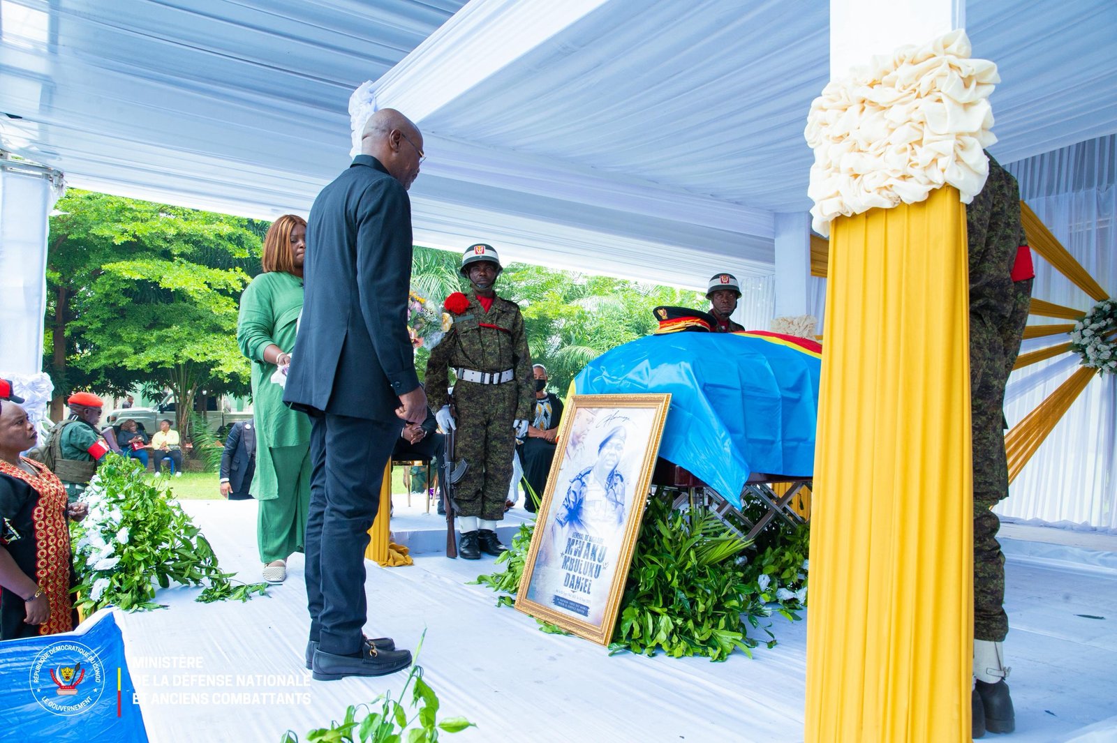 La cérémonie a réuni les plus hautes autorités du pays, témoignant de l’importance du défunt au sein de l’appareil sécuritaire national. Le Vice-Premier Ministre, Ministre de la Défense Nationale, Guy Kabombo Muadiamvita, représentait personnellement le Chef de l’État et Commandant suprême des FARDC, S.E. Félix Antoine Tshisekedi Tshilombo. Le deuxième Vice-président de l’Assemblée nationale, Christophe Mboso, ainsi qu’un important aréopage d’officiers généraux et supérieurs, ont également marqué de leur présence ce moment de recueillement national.